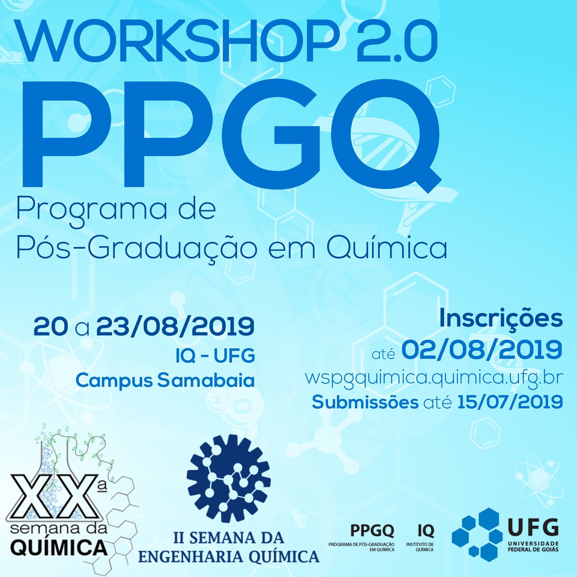 Já estão abertas as inscrições para o WORKSHOP DA PÓS-GRADUAÇÃO EM QUÍMICA DO IQ-UFG. Será uma edição comemorativa dos 20 anos da pós-graduação em Química e também irá divulgar e discutir pesquisas desenvolvidas no PPGQ.