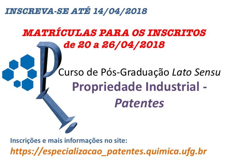 O curso de pós-graduação lato sensu, de nível especialização, em “Propriedade Industrial - Patentes” promovido pelo Instituto de Química da UFG busca atender a uma demanda crescente do mercado por profissionais capacitados para atuar na área técnica de patentes, nas atividades de busca e redação de patentes, de exames de patentes, de nulidades e fluxo de patenteamento, atribuições-chave na área de pesquisa e desenvolvimento dos setores público e privado e que necessitam ser executadas por profissionais altamente especializados. Este é um curso pioneiro que visa formar um profissional que vem sendo crescentemente valorizado, em especial, as indústrias farmacêuticas, alimentícias e automobilísticas têm buscado profissionais com essa expertise. Este curso é voltado a profissionais de todas as áreas do conhecimento, que tenham interesse na área de inovação e de patentes e se propõe a formar profissionais que atuarão brilhantemente em qualquer lugar do mundo.