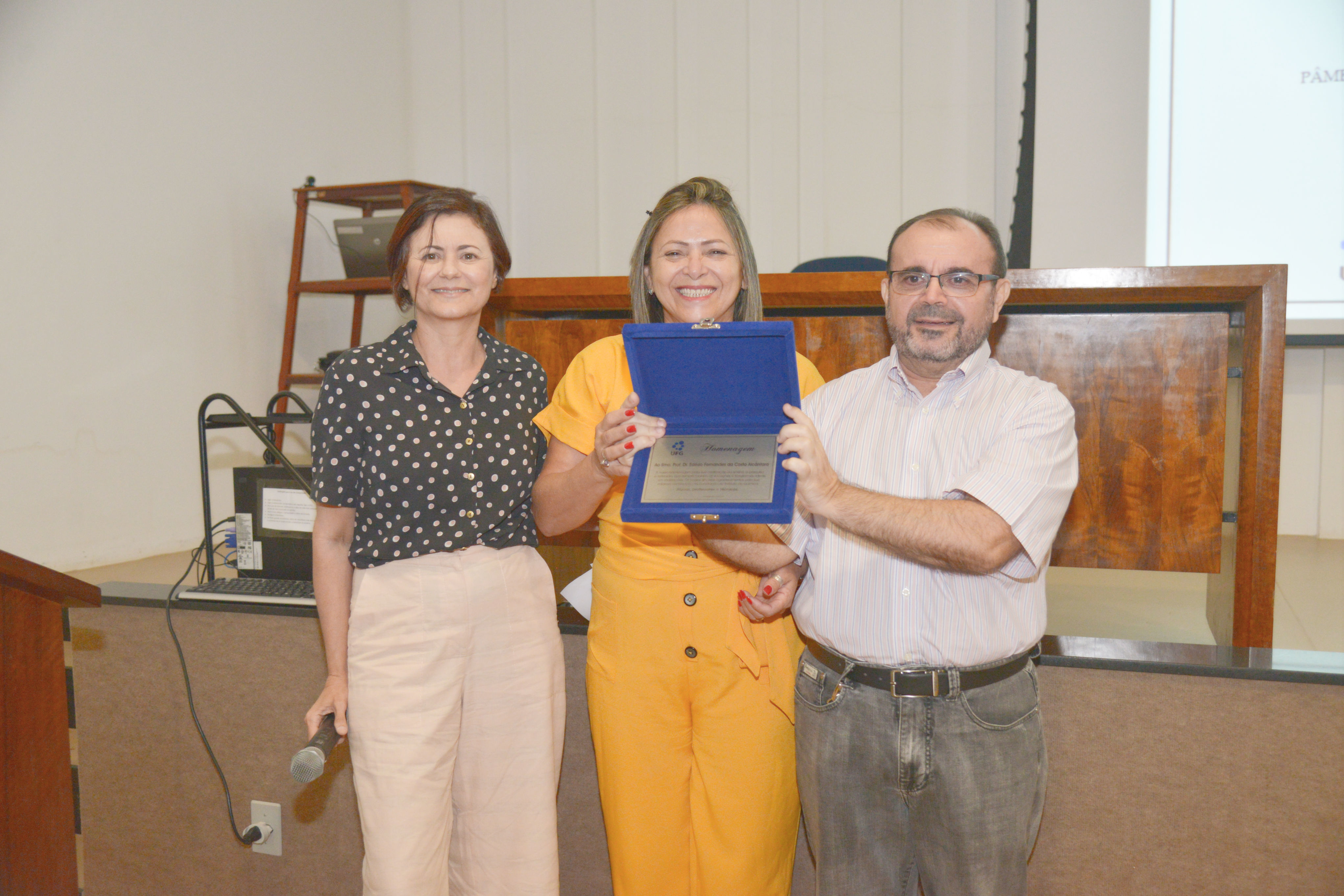 Edésio Alcântara (direita) mostra Placa de Homenagem entregue pelas professoras Emília de Oliveira (esquerda) e Liliane Nunes (centro). Foto: Ana Fortunato