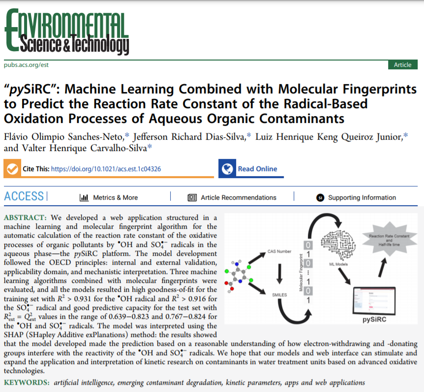 O Prof. Dr. Luiz Henrique Keng Queiroz Júnior publicou um artigo em um periódico de alto fator de impacto (9,028). O título do artigo é :pySiRC”: Machine Learning Combined with Molecular Fingerprints to Predict the Reaction Rate Constant of the Radical-Based Oxidation Processes of Aqueous Organic Contaminants".