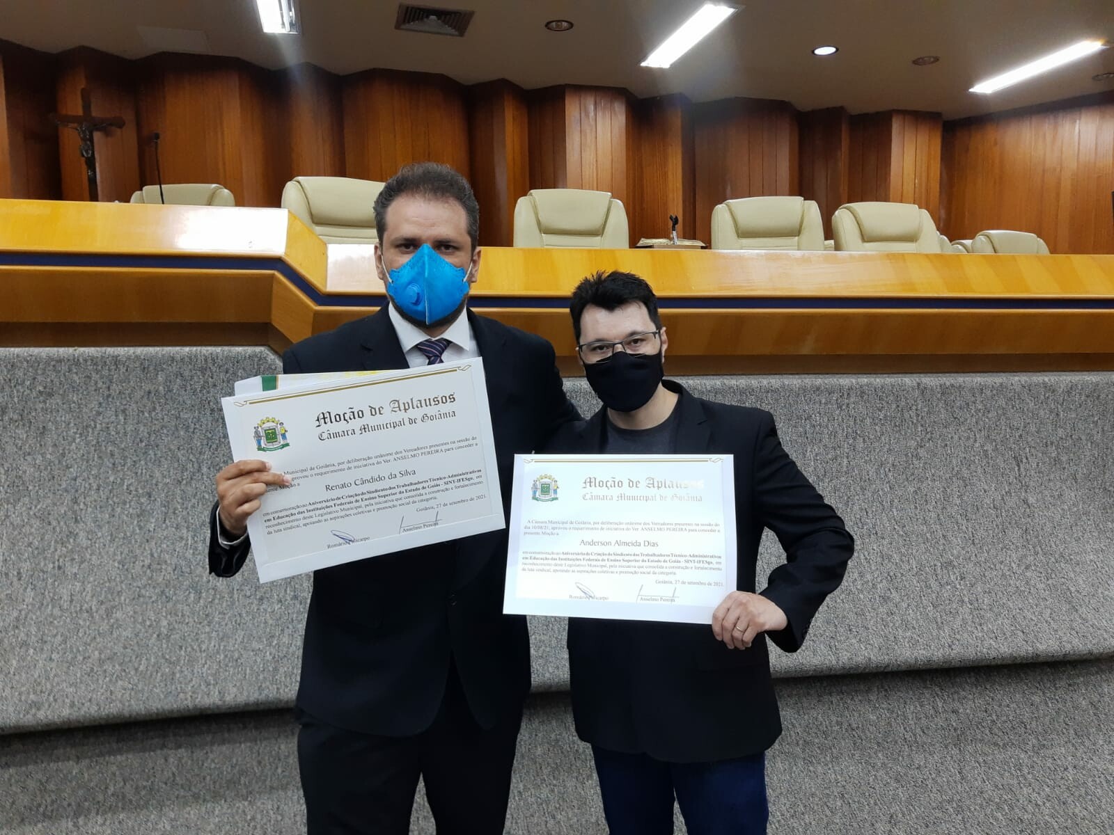 Na noite do dia 27 de setembro, Renato Cândido da Silva e Anderson Almeida Dias, servidores do IQ, receberam uma moção de aplausos por iniciativa que consolida a construção e o fortalecimento da luta sindical, apoiando as aspirações coletivas e promoção socias da categoria. A homenagem se deu em um evento que comemorou os 48 anos do Sindicato dos Trabalhadores Técnico-Administrativos em Educação das Instituições Federais de Ensino Superior do Estado de Goiás - SINT-IFESgo.