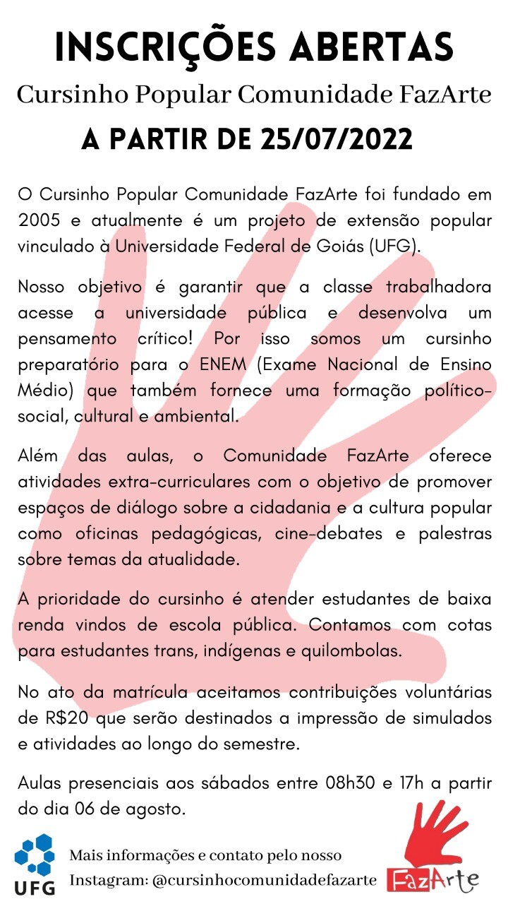 Inscrições abertas Cursinho Popular Comunidade FazArte