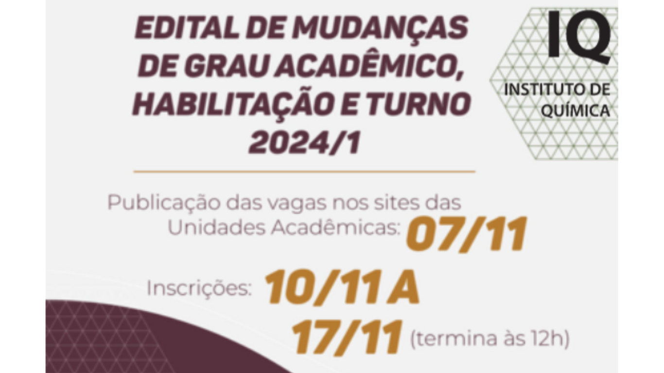 As inscrições para o processo seletivo de Mudanças de Grau Acadêmico e Turno para 2024-1 ocorrerão no período de 10 a 17/11/2023 (neste último dia as inscrições terminarão às 12h) a partir de link do Instituto Verbena da UFG disponibilizado no endereço eletrônico www.cga.ufg.br e o critério de seleção é a média global do estudante.