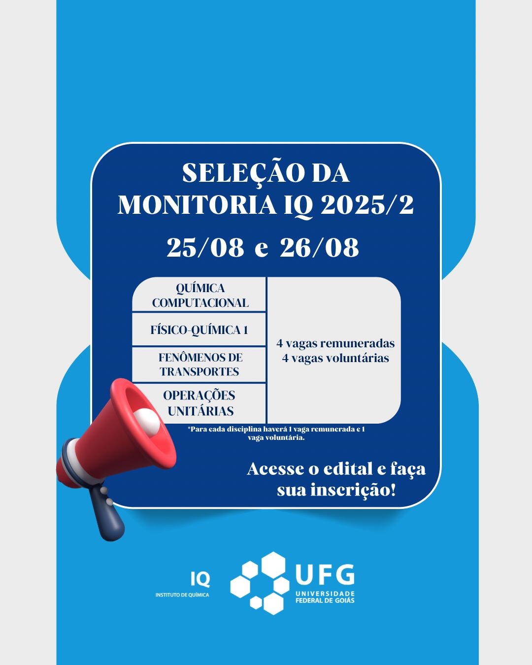 Dias 25 e 26 haverá seleção de monitores para Química Computacional, Físico-Química 1,  Operações unitárias e Fenômenos de Transporte.