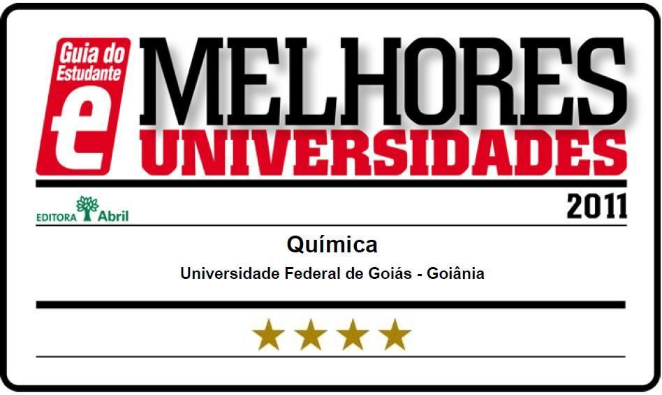 Temos o prazer de comunicá-lo(a) que o curso de Química do(a) Universidade Federal de Goiás - Goiânia foi estrelado na avaliação de cursos superiores realizada pelo Guia do Estudante (GE) e constará da publicação GE Profissões Vestibular 2012, que passa a circular nas bancas a partir do dia 6 de outubro.